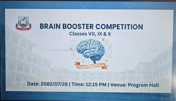 Our school proudly held the Brain Booster Competition for Grades VIII, IX, and X. We celebrate our students for their curiosity, confidence, and hard work as they learn, think, and explore. Every great idea starts with a question—well done to all our young thinkers! 🧠